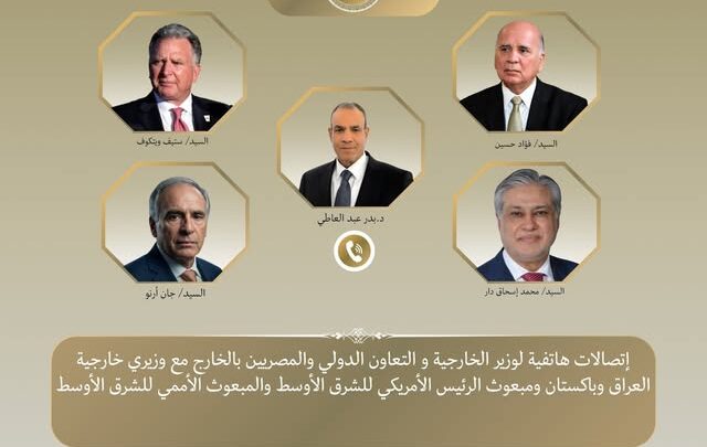 في إطار جهود خفض التصعيد واحتواء الموقف العسكري المتصاعد بالمنطقة، واصل د. بدر عبد العاطي وزير الخارجية والتعاون الدولي والمصريين بالخارج اتصالاته المكثفة حيث جرت اتصالات بين وزير الخارجية مع د. فؤاد حسين نائب رئيس مجلس الوزراء وزير خارجية جمهورية العراق، والسيد محمد إسحاق دار نائب رئيس الوزراء ووزير خارجية باكستان، والسيد ستيف ويتكوف المبعوث الأمريكي الخاص للشرق الأوسط، والسيد جان أرنو المبعوث الشخصي للسكرتير العام للأمم المتحدة للشرق الأوسط يوم الاثنين ٦ أبريل.
