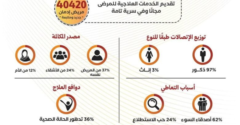نشر صندوق مكافحة وعلاج الإدمان والتعاطي انفوجراف على الصفحة الرسمية للصندوق ” الفيس بوك “عن مجهودات الخط الساخن للصندوق “16023”، خلال الربع الأول من عام 2026 ،حيث تم تقديم الخدمات العلاجية لعدد 40420 مريض “جديد ومتابعة”، كما يتم توفير الخدمات العلاجية لأى مريض إدمان من أبناء المناطق المطورة “بديلة العشوائيات” “الأسمرات، المحروسة، روضة السودان، روضة السيدة، أهالينا، الخيالة، بشاير الخير، حدائق أكتوبر”، وتنوعت الخدمات ما بين مكالمات للمتابعة والمشورة والعلاج والتأهيل والدمج المجتمعي، حيث إن الخدمات العلاجية تقدم للمرضى مجاناً ووفقا للمعايير الدولية، وبلغت نسبة المستفيدين الذكور من هذه الخدمات 97 % بينما بلغت نسبة الإناث 3%، حيث تردد المرضى على المراكز العلاجية التابعة للصندوق والشريكة مع الخط الساخن وعددها 35 مركز بـ 20 محافظة حتى الآن.