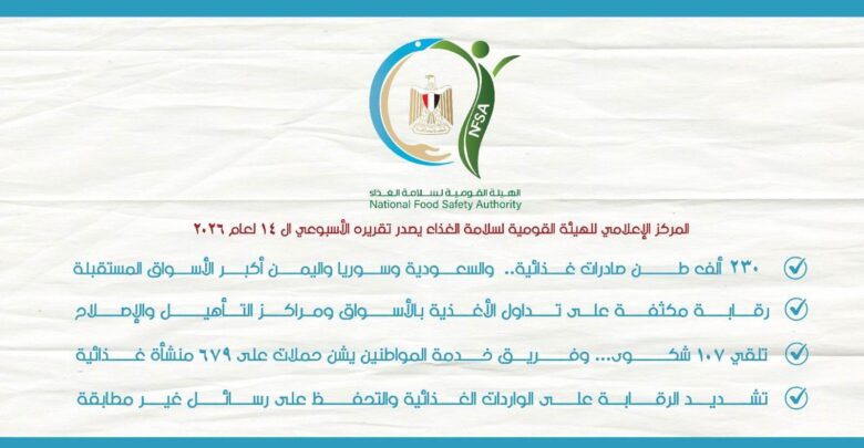 المركز الإعلامي للهيئة القومية لسلامة الغذاء يصدر تقريره الأسبوعي الـ 14 لعام 2026